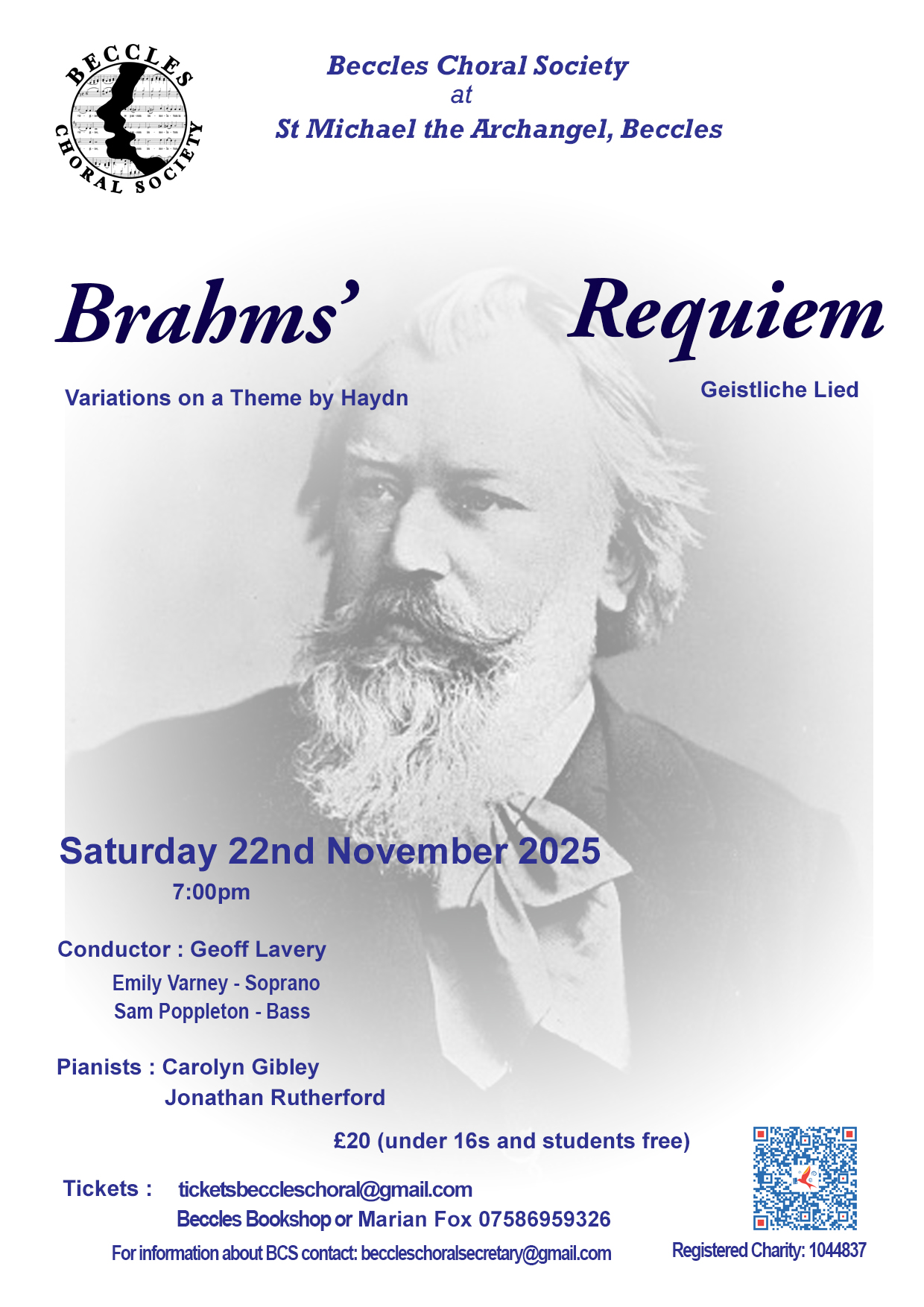 Tickets available from Beccles Bookshop or by email - ticketsbeccleschoral@gmail.com £20 (under 16's and students free)